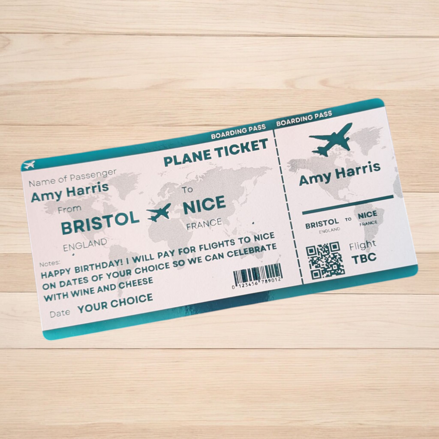 Whether it’s a surprise city break, a romantic weekend getaway, or a sun-soaked holiday abroad, this custom ticket is the perfect way to reveal the adventure. Personalise it with names, destination, travel dates, and a heartfelt message – then choose from stunning foil colours to suit the occasion.